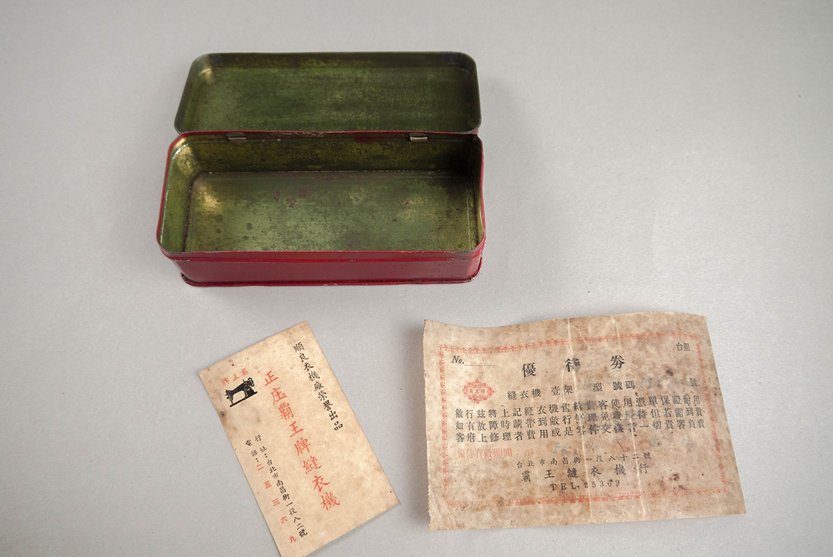 含上蓋及盒身,內含民國56年保固書優待券一張、正庄霸王牌縫衣機名片一張。